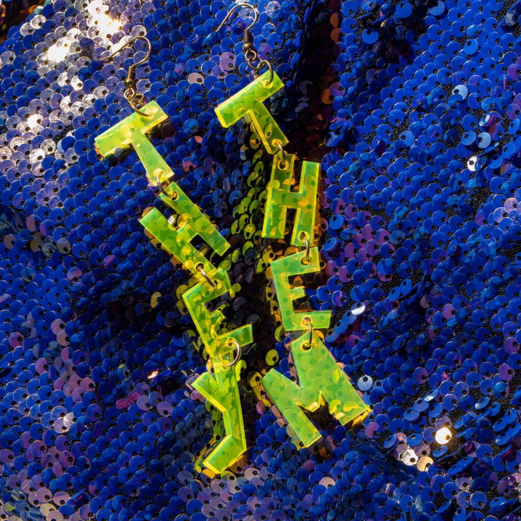 Customizable pronoun earrings in a variety of colors! Message me in my “Contact” form to inquire.